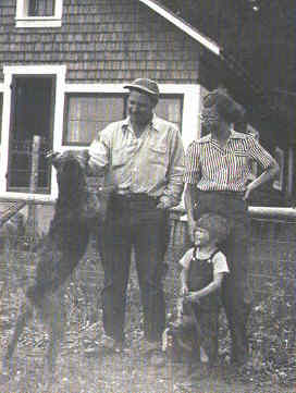 Above is a photo taken in 1945 in front of the manager's residence at Hahn's Peak. From L to R - "Bob (dog)", Chuck, Marge and daughter, Martha. |