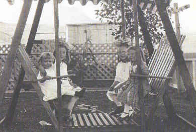 The photo to the left is Marge as a baby with her mother, Minnie Pearl Hartt. Below and to the left are four Hartt sisters on a swing in Rawlins, Wyo. From L to R - Lou, Marie, Pearl and Marge |